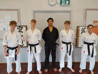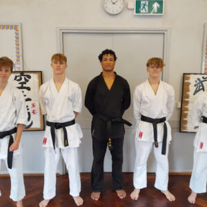 - October 2023: four new blacks, all highly deserving of this massive milestone in their career, after years of training and all of them undeterred by the set-back of the pandemic. Pictured with assistant examiner, David (Shodan), centre.