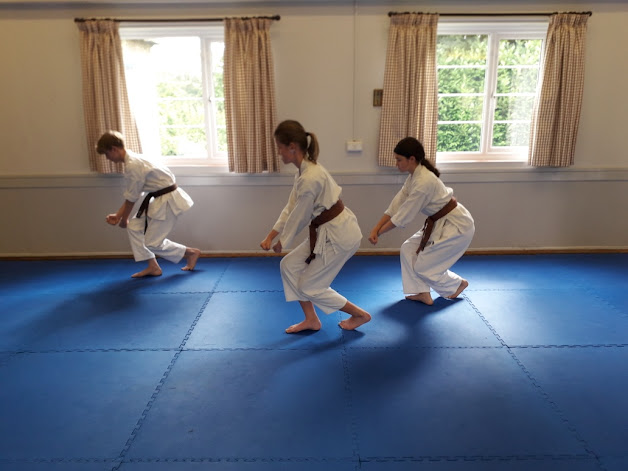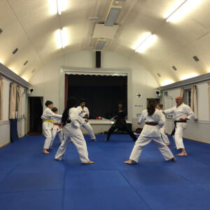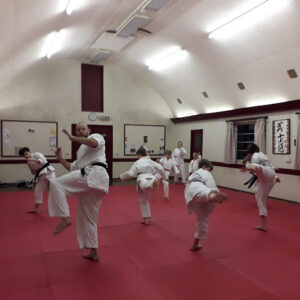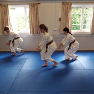 - Kata practice. Sensei Lynn, front right, showing perfect form for shikodachi – ‘horseriding stance’ here.