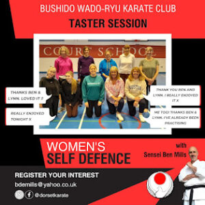 - Summer 2024: we were asked by several ‘karate mums’ to run a 10-week women’s self-defence course, teaching tried-and-tested strategies & techniques to help people stay safe.